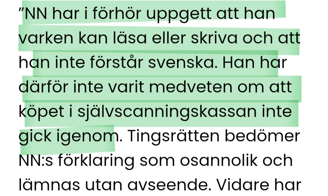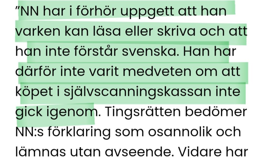 Nej, det är inte osanonolikt att NN är analfabet förstås men det måste vara jobbigt att handla om man inte kan läsa på förpackningar eller nånting. Aja, han gick väl sossarnas Alla ska med-skola och han är tyvärr inte speciellt osannolik i det här fekaliesamhället. Lite förvånad att han inte blev friad. Invandrare brukar få göra shit som svenskar skulle åka i fängelse för direkt. Han skulle kunna skriva en text som denna fast ”peka ut” svenska analfabeter som stjäl. Om jag gör det mot invandrare är det HMF direkt men han får skriva vad han vill om svenskar… om han lär sig skriva alltså. Kan jag hjälpa till med något?